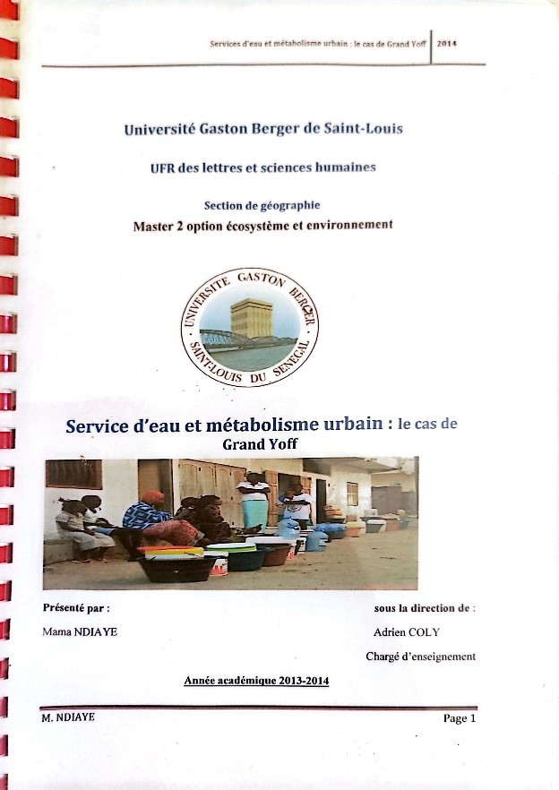 Services d’eau et métabolisme urbain : le cas de Grand Yoff. Mémoire de Master Université Gaston Berger de Saint-Louis, UFR des lettres et sciences humaine département de Géographie